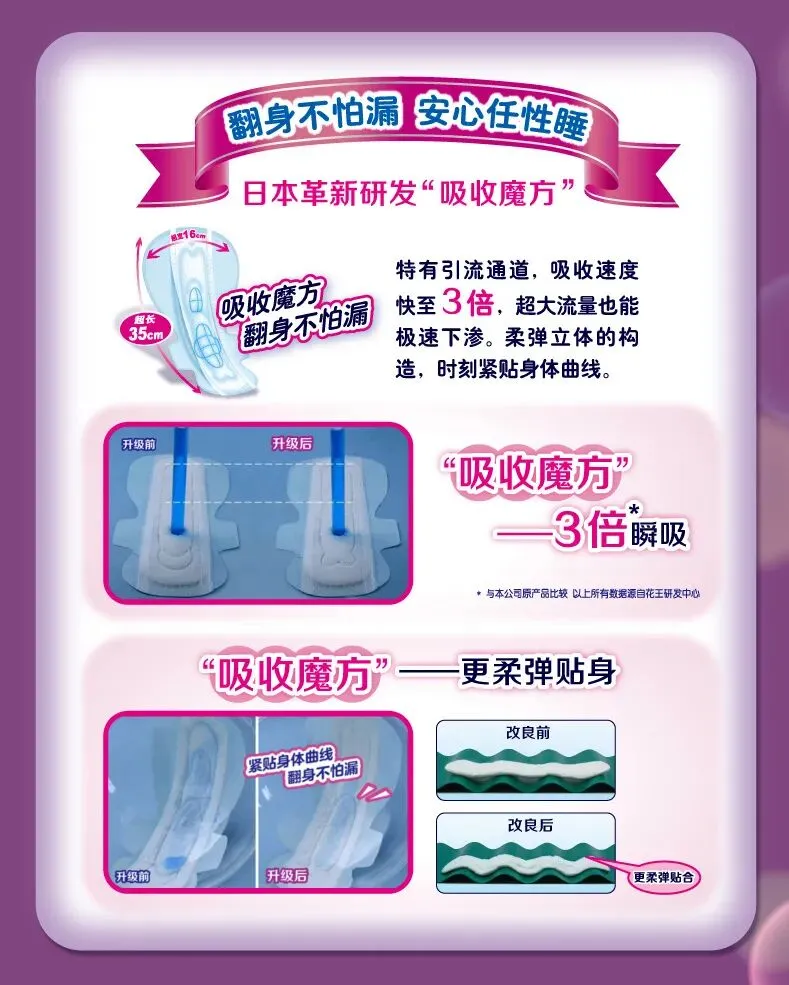 独特的凹凸型吸收体,达到迅速吸收,整夜防漏,吸水更快更干爽。10万+魔力吸水珠,可吸收200倍,快速导流经血下渗,经血不易残留在表层。