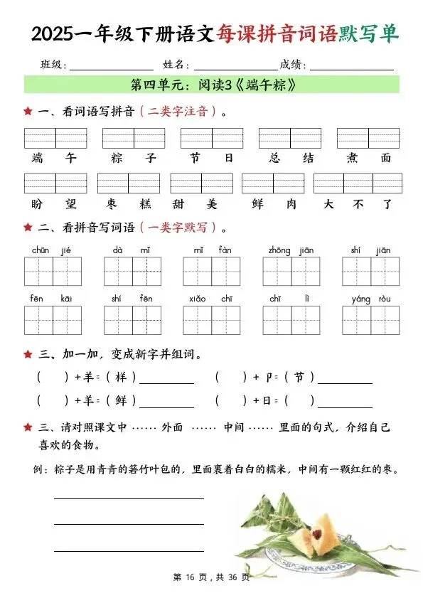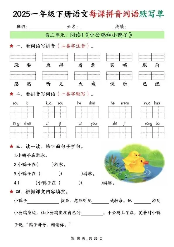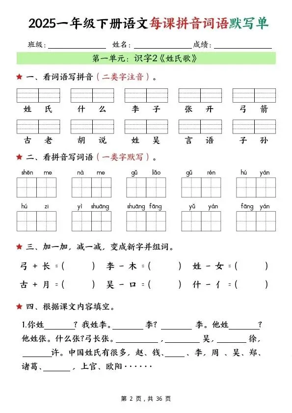新一年级下册语文每课拼音词语默写单(完整电子版可打印)
