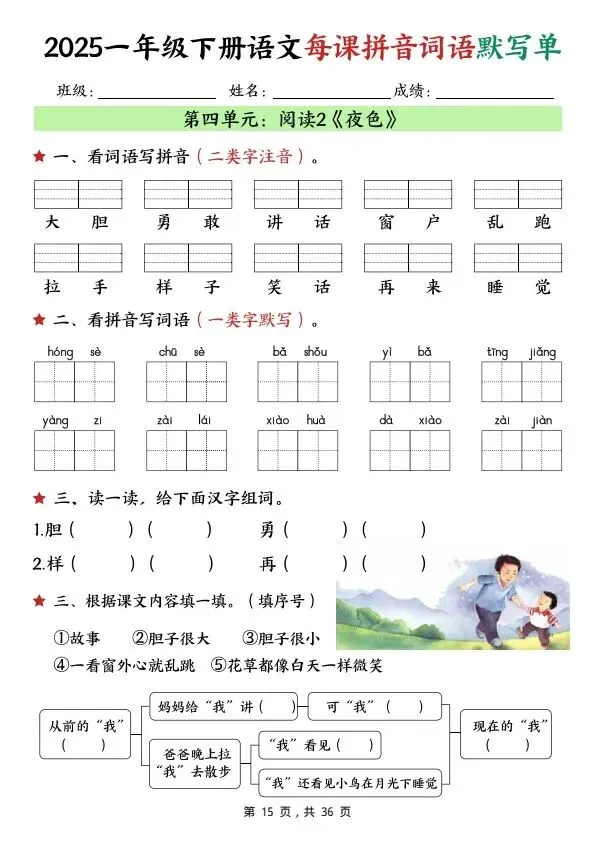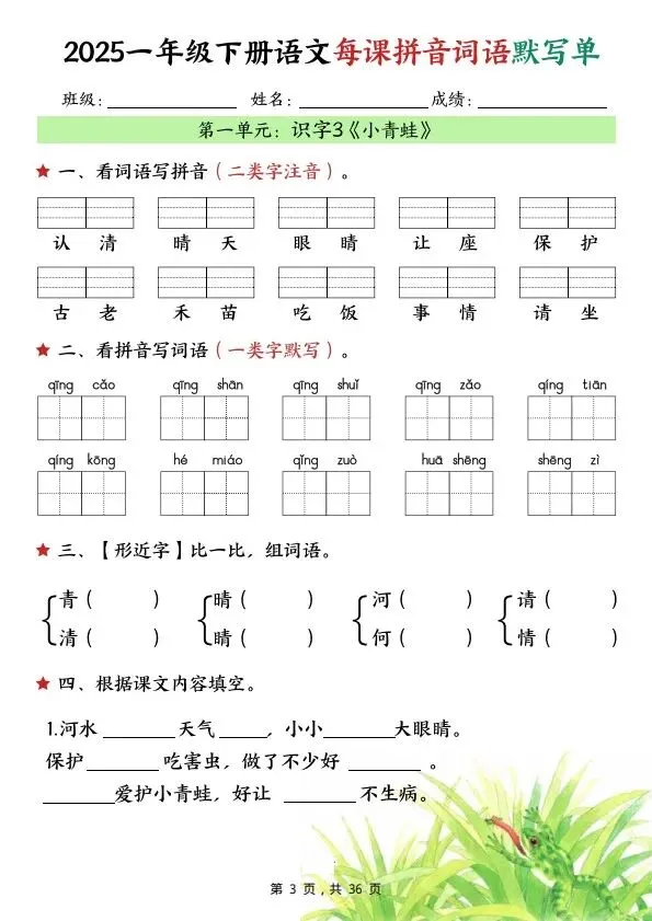 今日分享新一年级下册语文每课拼音词语默写单(完整电子版可打印)!高清电子版可直接打印,排版规整适配练习,不用费心整理,孩子每日一练夯实基础,家长辅导省心!