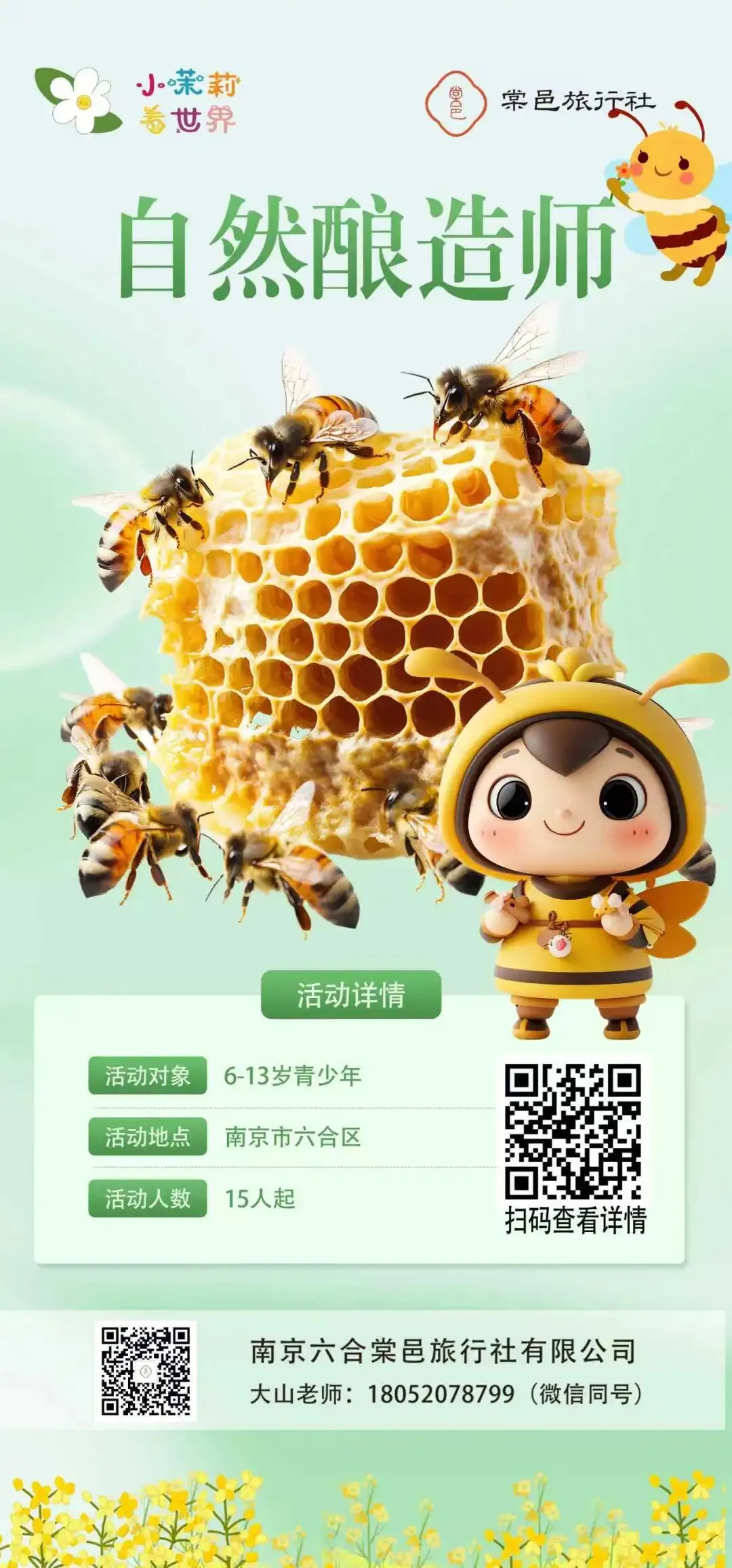 “小茉莉看世界”是棠邑旅行社自主开创的亲子研学品牌,立足六合乡村旅游、非遗等资源优势,致力成为本地亲子研学产品的开发商和运营商。秉承“户外即学校、玩乐即学习”的理念,将户外体验活动融合传统文化、科学创新、自然探索、职业体验等元素,并结合孩子爱玩的天性,设置主题任务与游戏,通过“场景”“体验”“引导”“跟踪”的模式,开发研学各类课程。