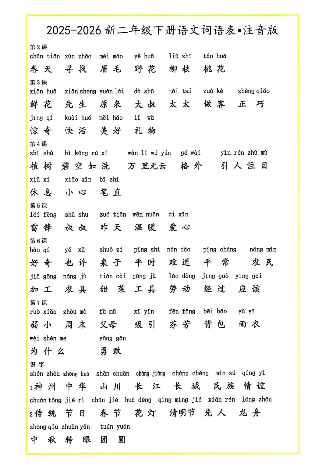 (高清图片,可直接打印)2025-2026新二年级下册语文词语表•注音版