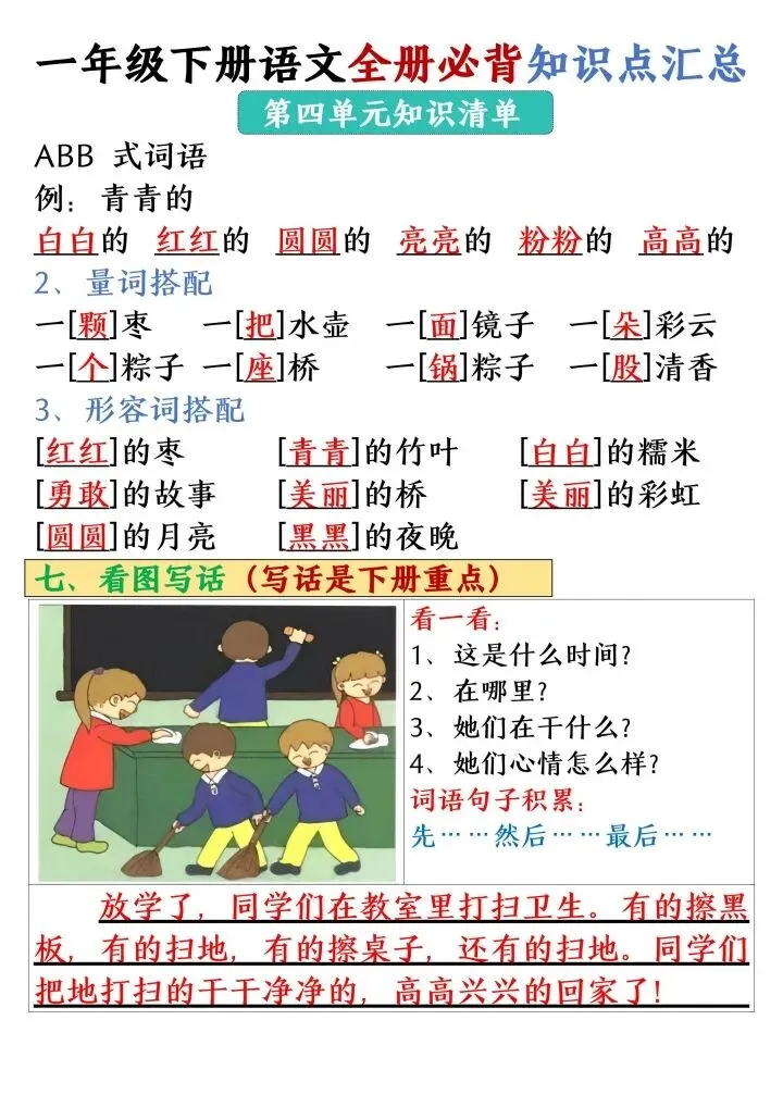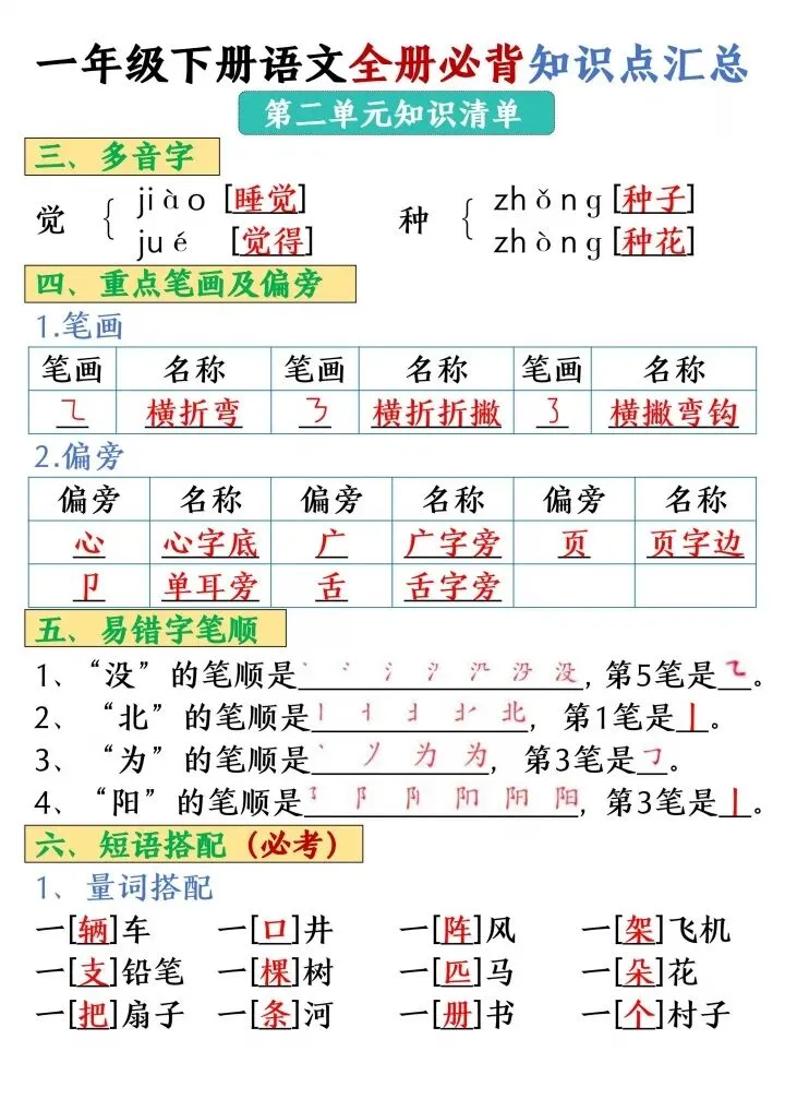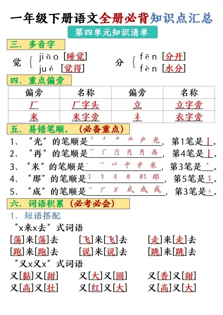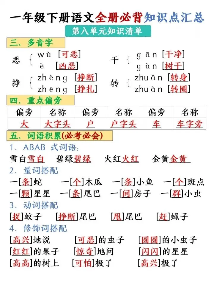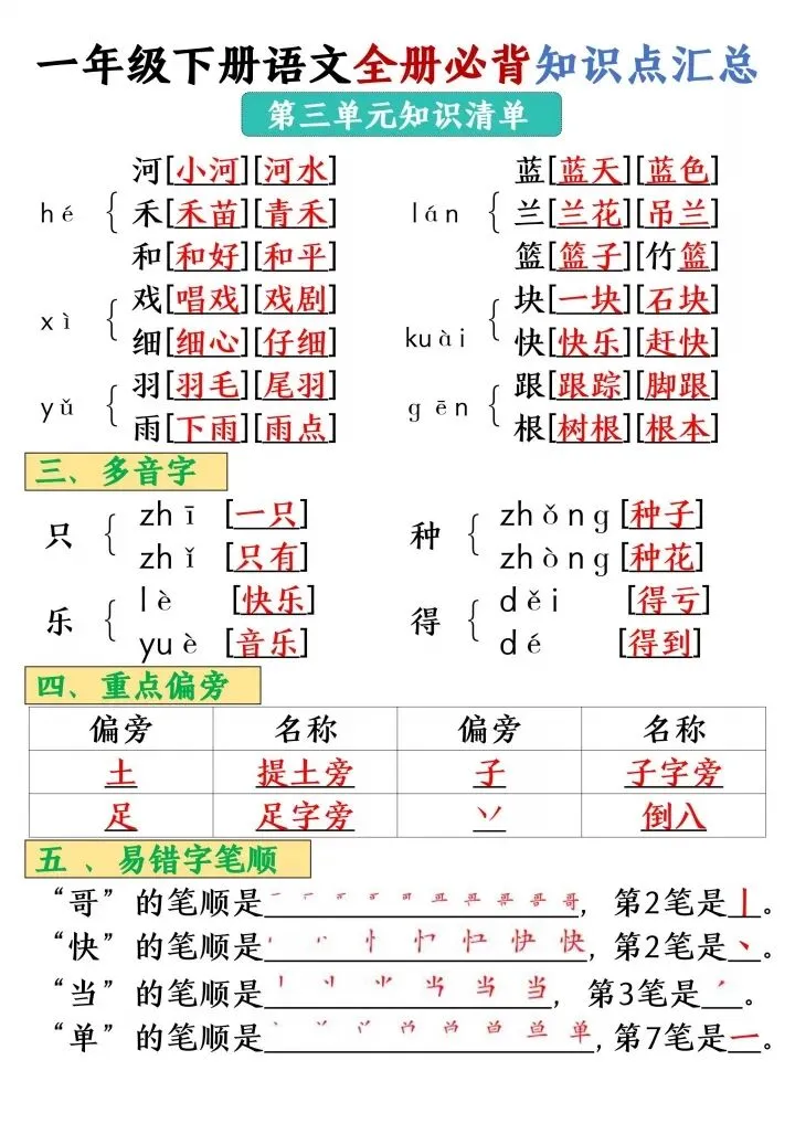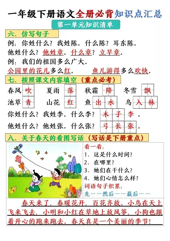 一年级下册语文全册必背知识点汇总(完整电子版可打印)