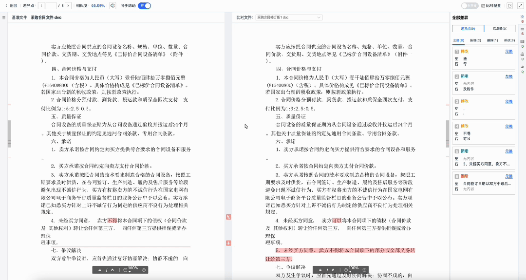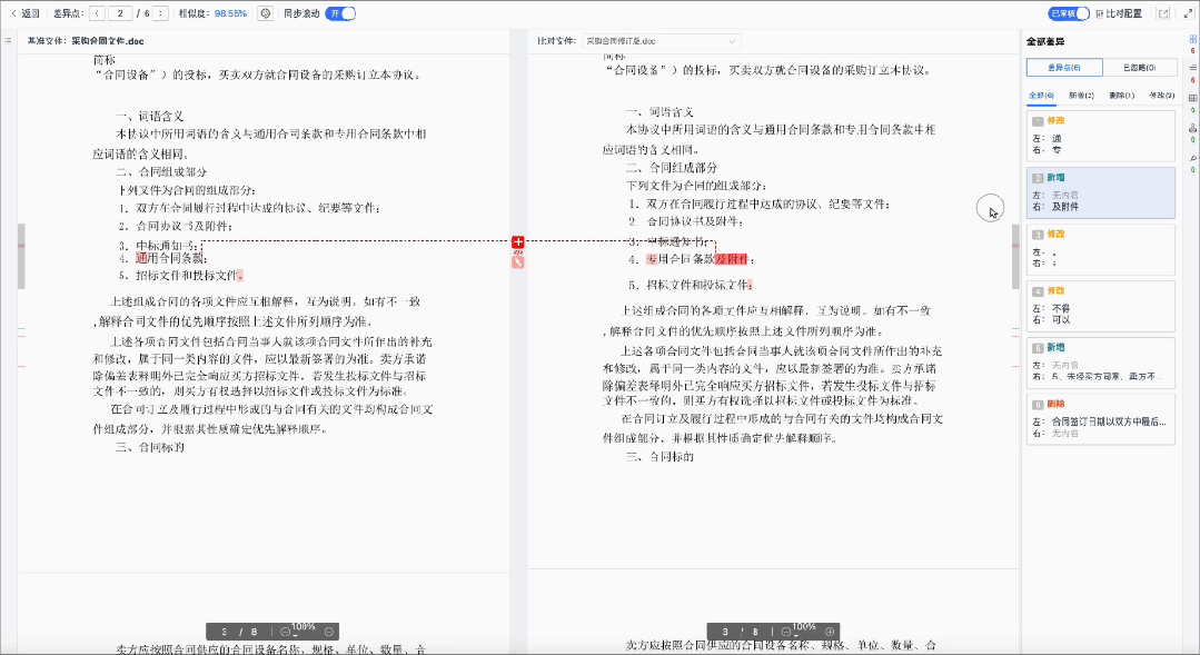 差异内容高亮显示、一键定位查看,单屏/双屏浏览,审核人员无需在长文档中反复翻找,即可快速掌握差异。