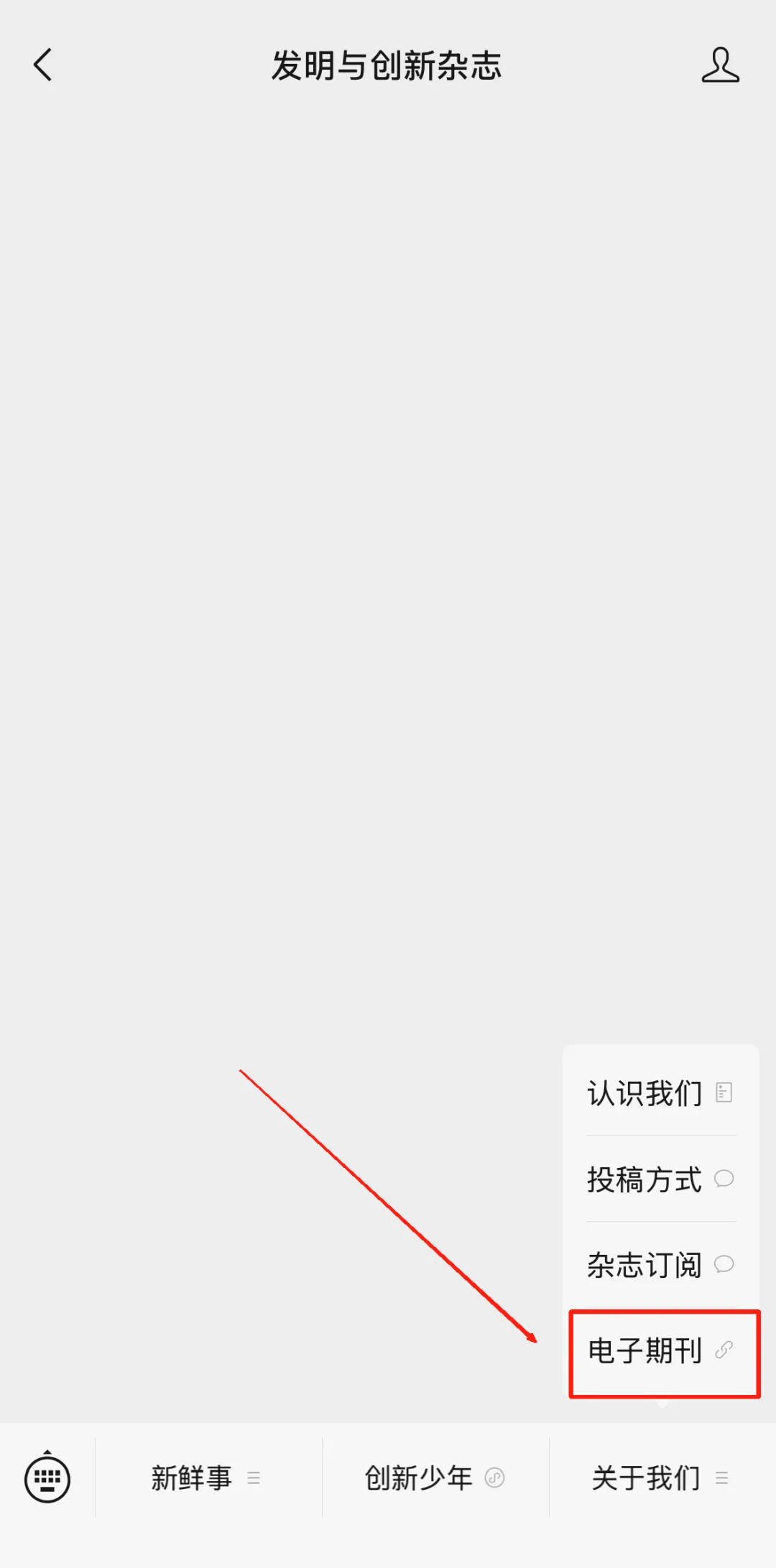 关注发明与创新杂志公众号,点开“发消息”-选择底部菜单栏的“关于我们”-点击“电子期刊”即可进入电子图书馆。