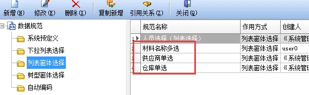 8、为 “材料名称” 设置对应的列表窗体数据规范。
