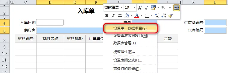 3、按住 Ctrl 键,用鼠标选中表头对应的录入单元格,点击【设置单一数据项目】。