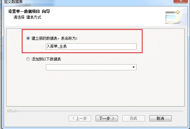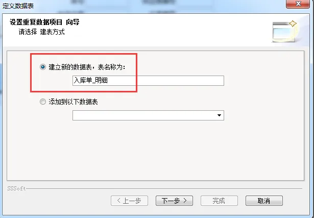 4、新建数据表名称为 “入库单_明细”,点击下一步。