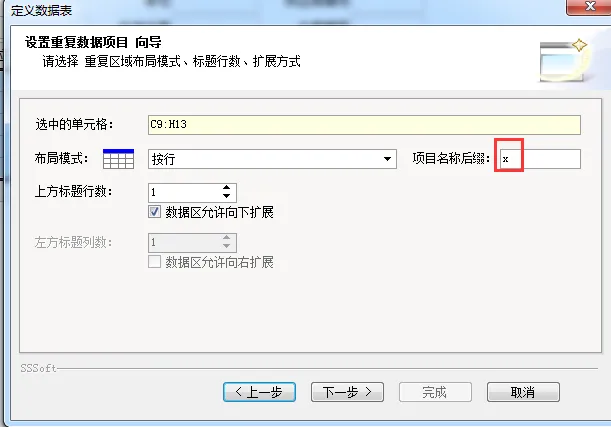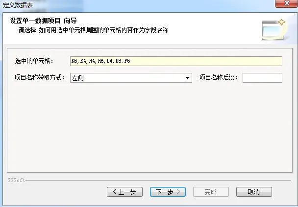 5、上方标题行数默认是 1 行,和本表一致,直接用默认即可;如果你的表有多行标题,这里要按实际修改,否则字段名称提取不完整。在 “项目名称后辍” 中填入字母 “x”,先这样设置,后面讲表间公式时会说明原因。继续点击 “下一步”“完成”。