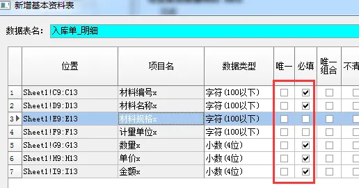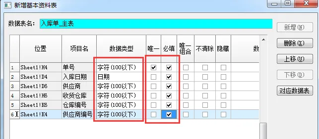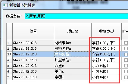 6、除 “入库日期” 外,其他字段的数据类型统一设为 “字符(100 以下)”,并根据需要勾选 “唯一” 和 “必填”。