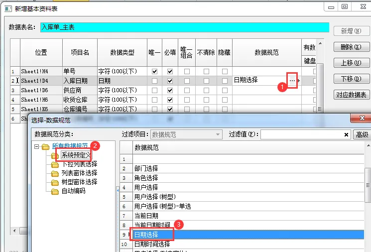 7、给 “入库日期” 设置数据规范为 “日期选择”。