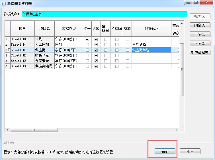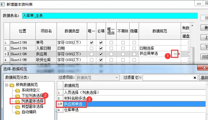 建立仓库信息表、供应商信息表,并做好对应的单选数据规范。