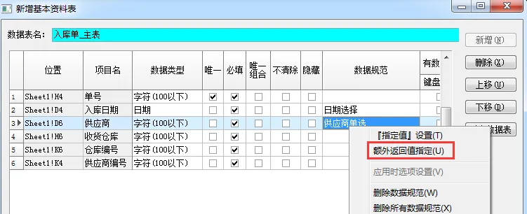 9、在 “供应商单选” 上点右键,选择【额外返回值指定】。