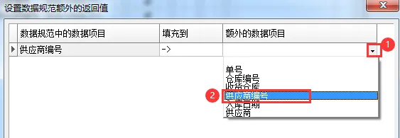 10、在弹出的窗口中,将 “供应商编号” 对应的 “额外的数据项目” 设为 “供应商编号”。