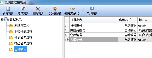 13、打开【系统管理】→【数据规范】→【自动编号】,新增一条 “入库单号” 规范。