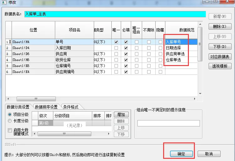 16、给 “单号” 字段绑定刚才建好的 “入库单号” 规范,点击确定保存。