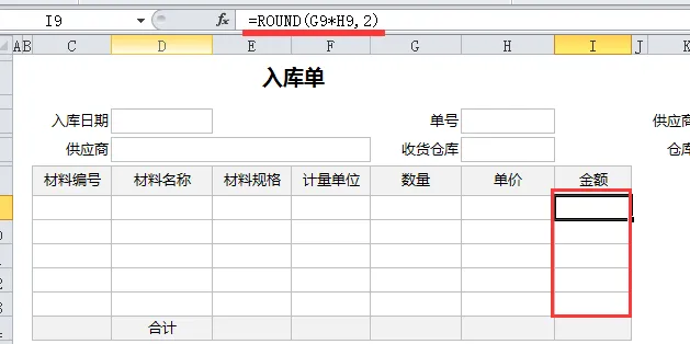 1、因为明细表中 “金额 = 数量 × 单价”,我们先给金额列添加 Excel 公式:“=ROUND(F2*G2,2)”,并用快捷键Ctrl+D批量填充到整个金额区域(H9:H13)。