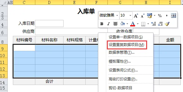 3、选中明细表录入区域(C9:H13),不包含标题行和合计行,右键选择【设置重复数据项目】。