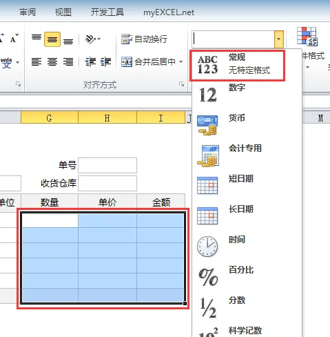 10、关闭设置窗口,回到 Excel 界面,选中数量、单价、金额区域,将单元格格式设为 “常规”。