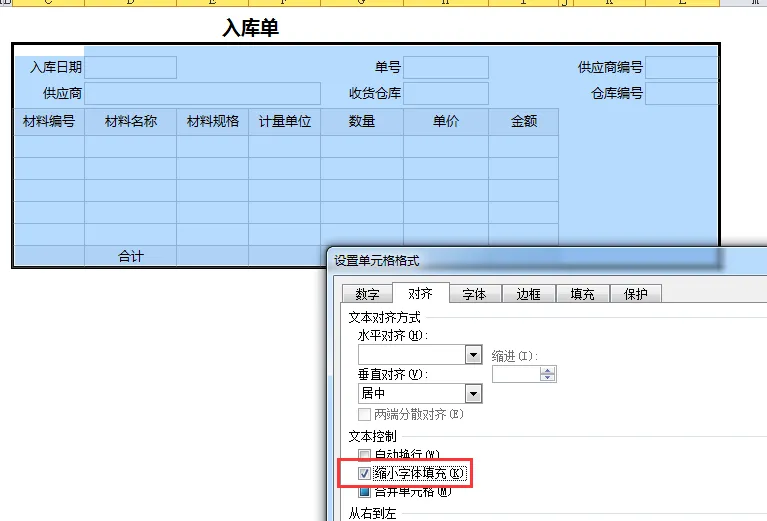 11、选中整张单据的所有录入区域,右键打开【设置单元格格式】,勾选 “缩小字体填充”,避免内容过长显示不全。