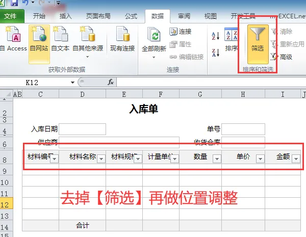 4、另外特别注意:如果明细表的数据列之前开启过 “筛选”,调整位置前一定要先取消筛选,否则操作过程中可能出现异常或报错。