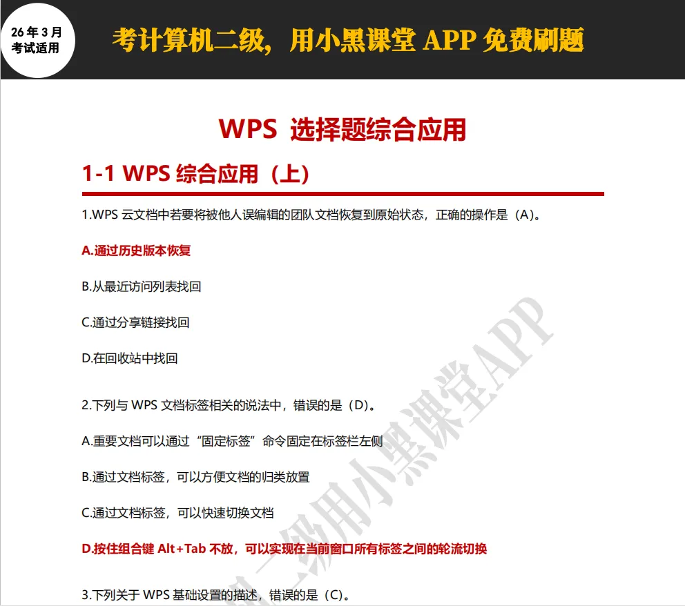 【2026年3月最新】计算机二级WPSoffice精选必刷300道选择题及考前押题资料
