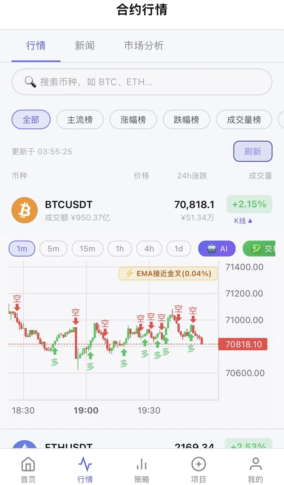行情列表支持搜索和分类筛选,主流币、热门标的一目了然,价格变动实时高亮显示。