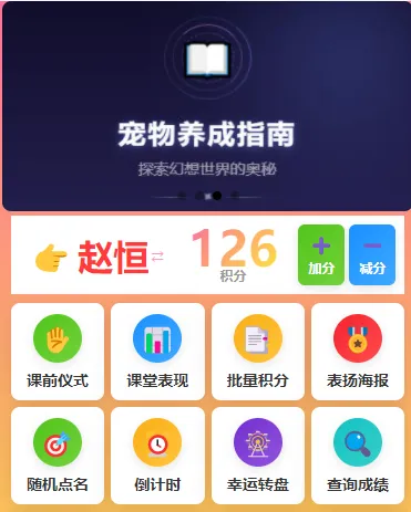 想要宠物园运行起来,首先是要在积分端操作,可以根据学生的各项表现,给学生加分,可以单独给个人加分,也可以批量给小组加分,全班加分,都是运行了几年的功能,稳定高效,老师们可以放心使用。