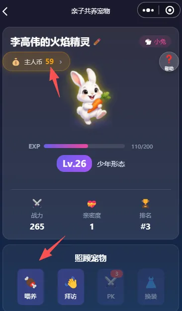 电子宠物的主人币与积分强关联。1积分=1主人币。学生喂养宠物会消耗主人币,但个人积分不会减少,积分可以一直累加。如果有新一轮积分周期,老师可以清零积分,主人币也会清零,但宠物的成长经验会保持,下一轮学生挣得积分后可以继续喂养宠物。