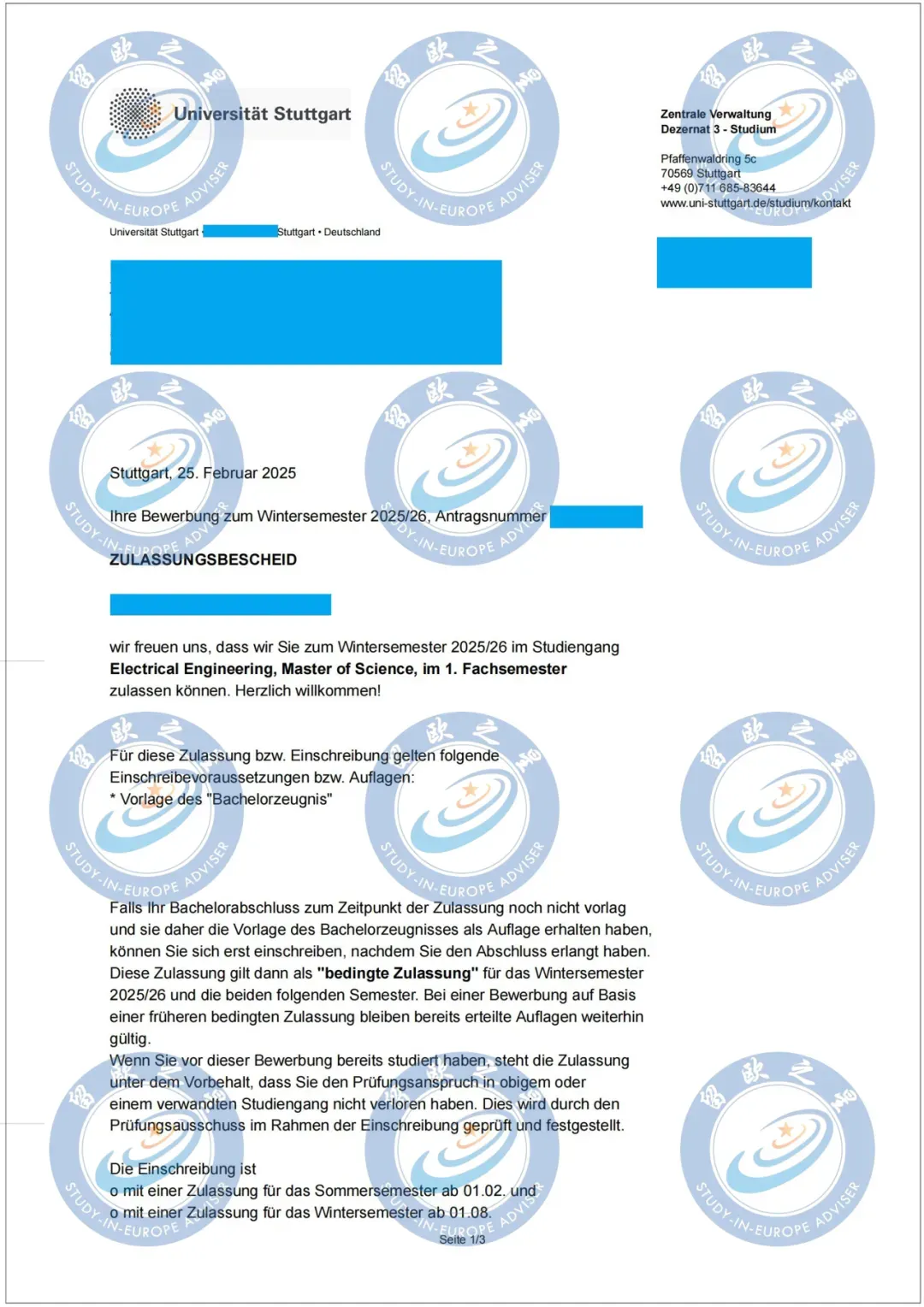 录取院校&专业:德国 斯图加特大学 & 电气工程硕士 2025年冬季入学