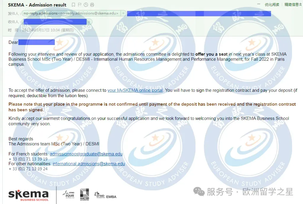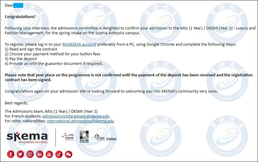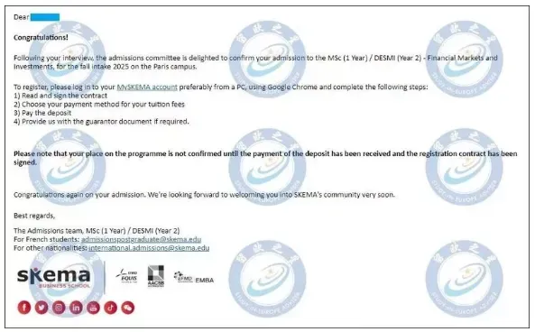 录取院校&专业:法国SKEMA商学院 金融市场与投资理学硕士学位项目