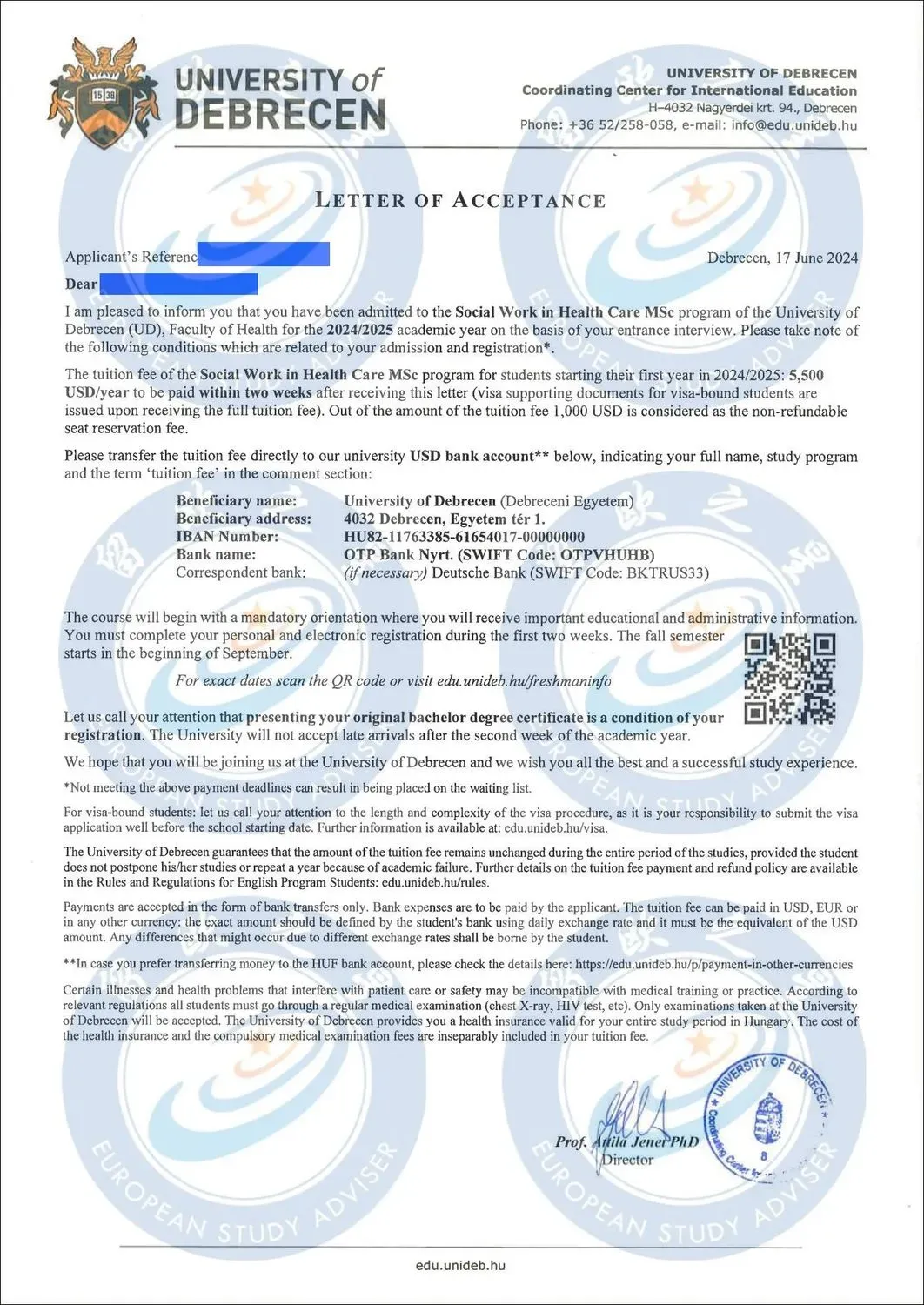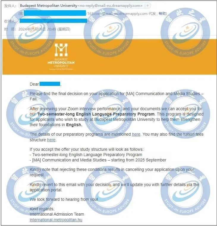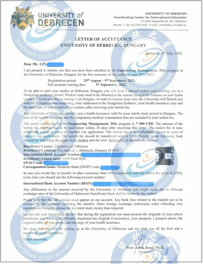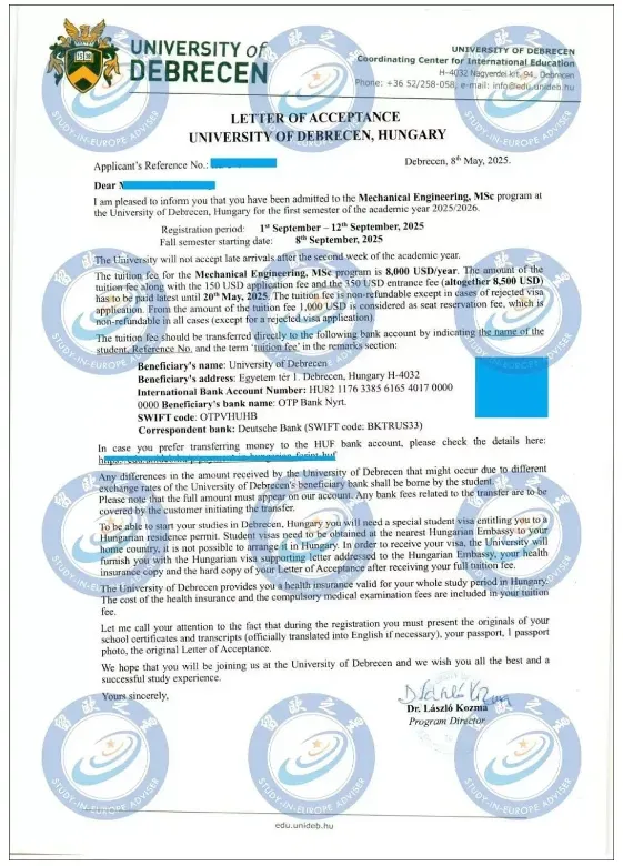 录取院校与专业:匈牙利德布勒森大学(机械工程硕士)