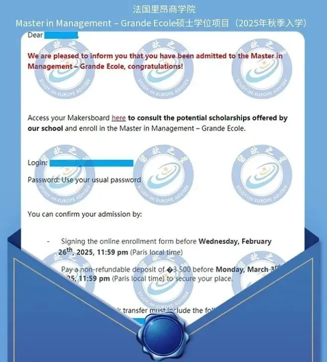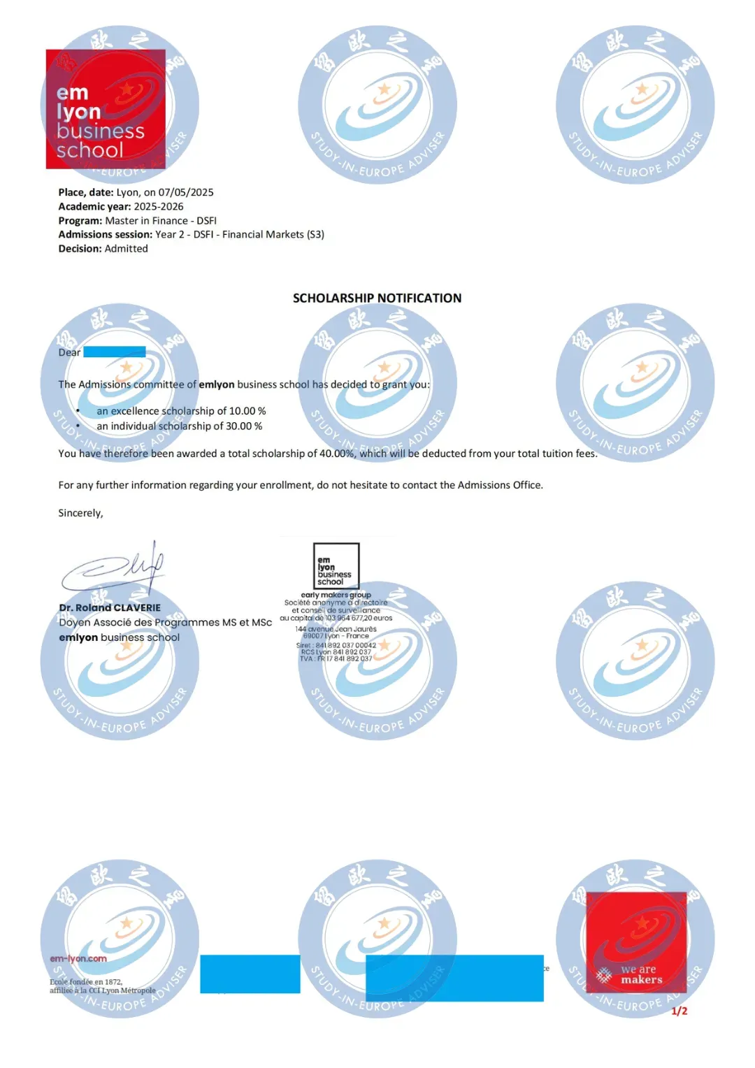 2、法国里昂商学院(GE项目管理学硕士)同时获得total 25% official scholarship