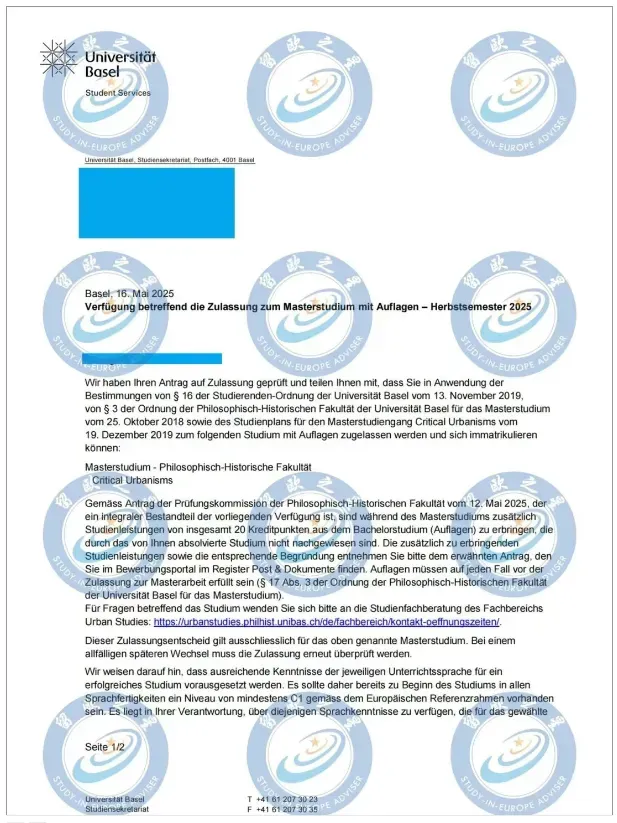 录取院校与专业:瑞士巴塞尔大学 (批判性都市主义硕士)