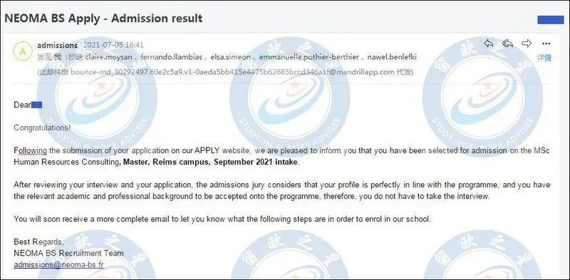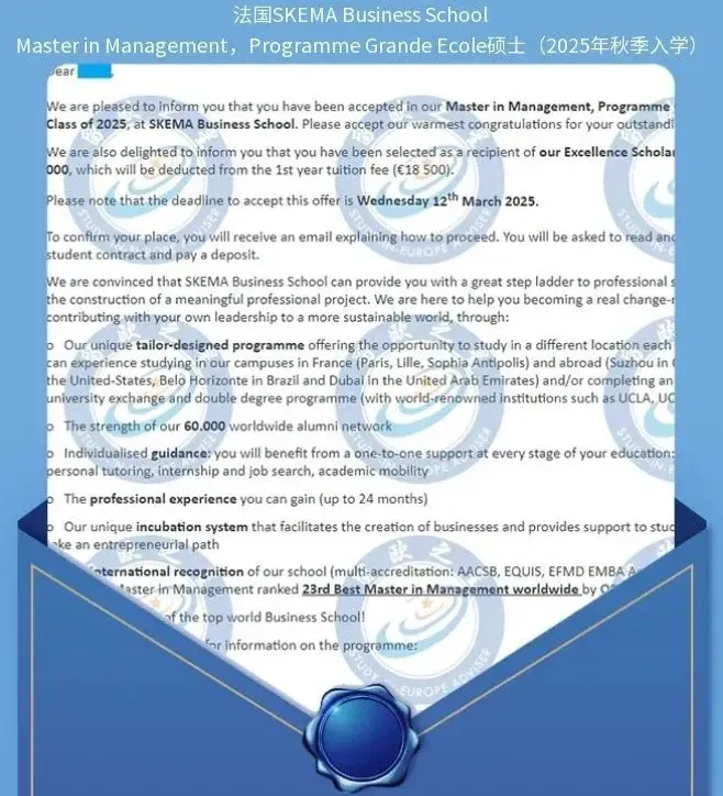 3、法国SKEMA 商学院 (GE项目管理学硕士)同时获得Excellence Scholarship, worth €3 000