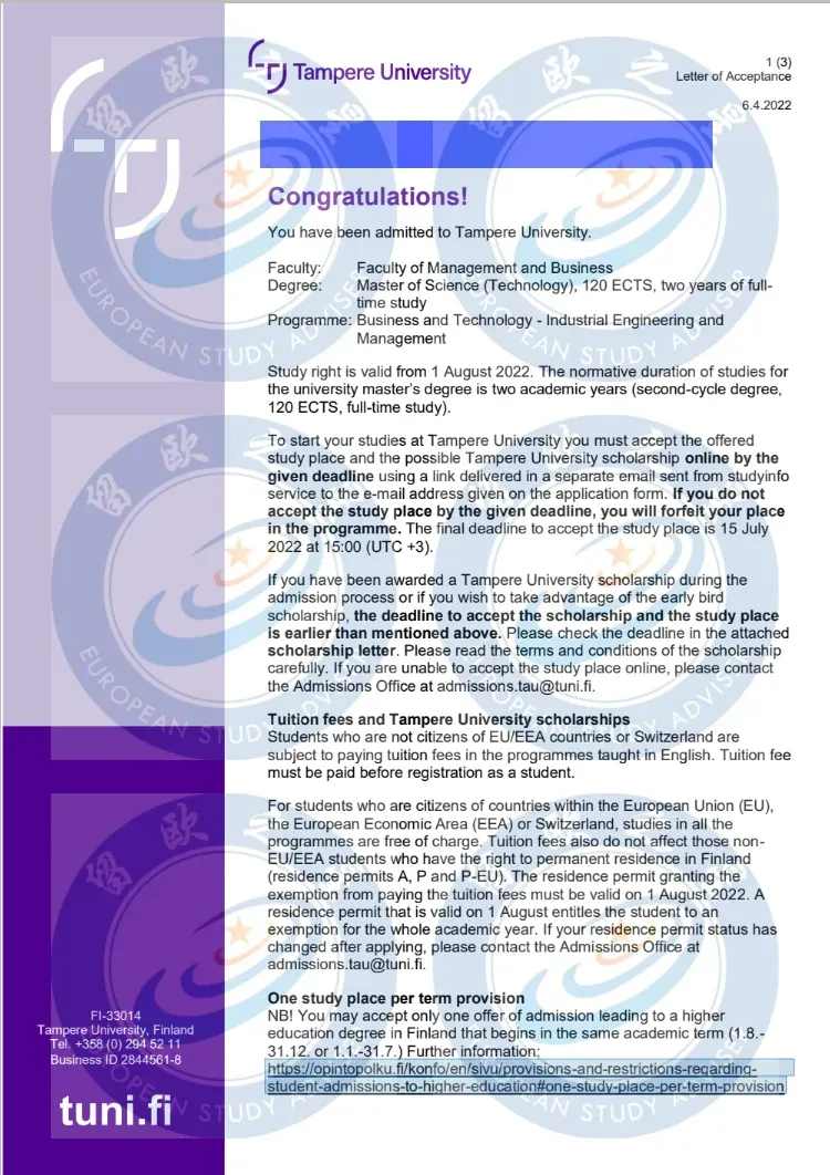 2、芬兰坦佩雷大学 (工业工程与管理-商业与技术)