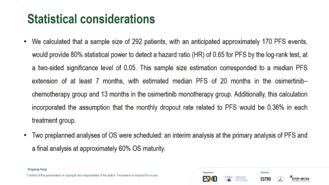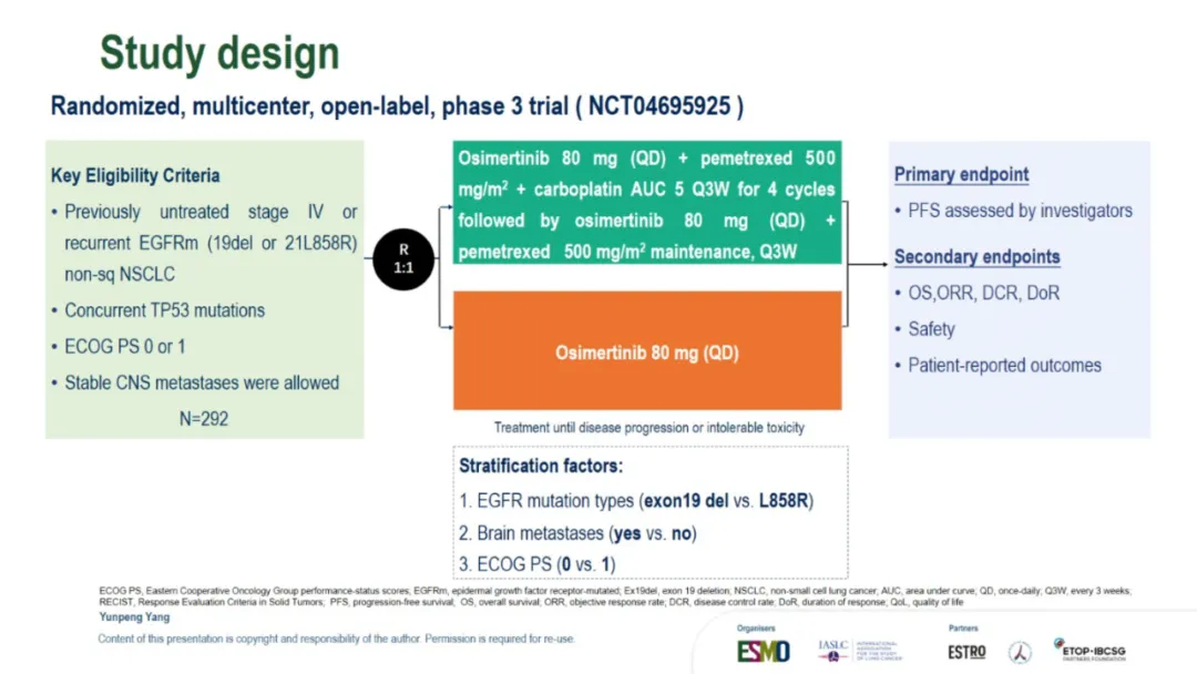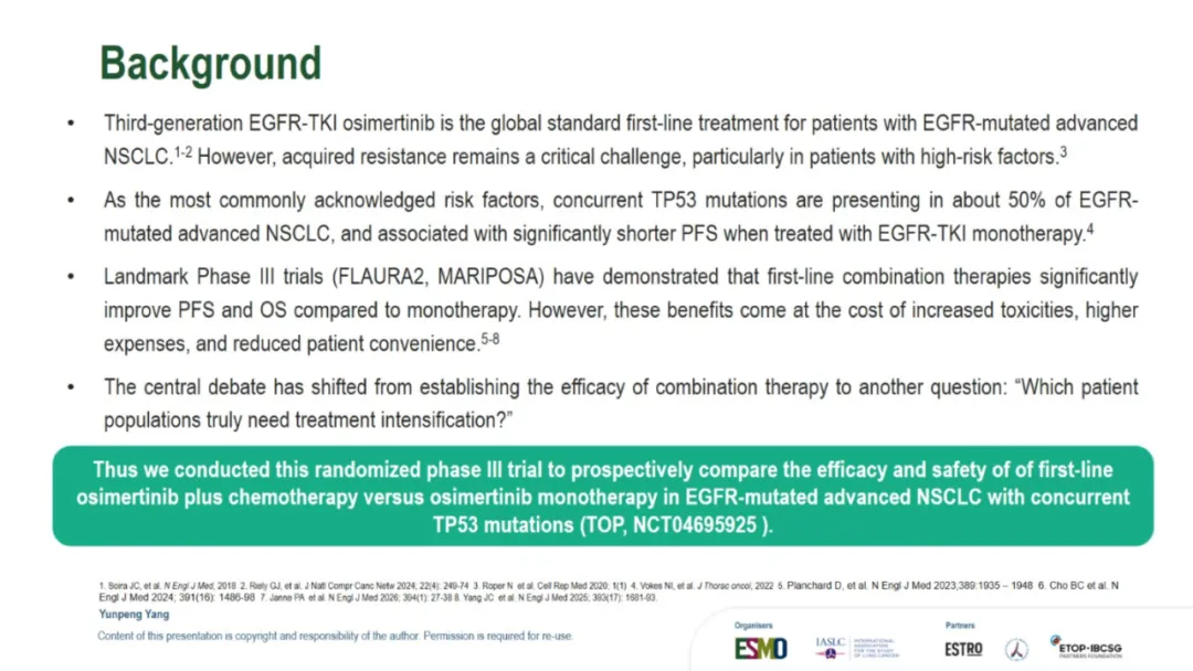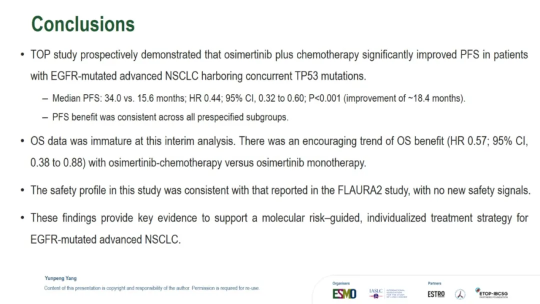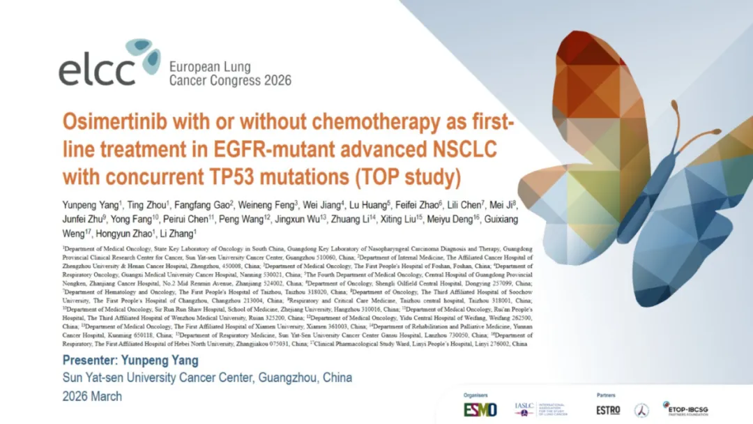 就在昨夜凌晨,TOP研究进行了口头汇报,因此也让我们看到了此次公布的所有数据:TOP研究的leading PI是广州中山大学肿瘤防治中心的张力教授,此次进行口头汇报的是杨云鹏。背景其实没什么特别的,大概意思就是:EGFR合并TP53共突变的患者预后差,因此可能更需要强化治疗。以下是研究设计。和FLAURA2相似,只是入组人群选的不是所有EGFRm的而是同时合并TP53共突变的。主要研究终点是PFS。预计的PFS HR是0.65,OS会在PFS分析的时候做一次分析,在60%成熟度的时候做最终分析。由于前几天发的一篇文章我在想为什么TOP和ACROSS2的PFS大相径庭,我提出了是不是因为ACROSS2研究中患者自行决定停药的比例太高?PFS翻倍,延长1.5年【2026 ELCC 奥希替尼联合化疗治疗EGFRm合并TP53共突变NSCLC的TOP研究结果公布了】因此,在看TOP研究的时候我也特意关注了这点。但是TOP研究中并不高,都在个位数,只是培美维持治疗时患者决定停药的比例略高是11%。再来看看基线:研究设计中,将是否有脑转移、19 del 还是21 L858R以及PS 0和1进行了分层,所以尤其这几个因素上,基线肯定是平衡的。脑转移患者占到了将近50%。像摘要中写的一样,mPFS是34.0 vs 15.6m,延长了18.4个月,也就是一年半。HR值是0.44,低于预期的0.65,而P值<0.001也低于设定的0.005,因此PFS是具有统计学差异的。数据成熟度59.2%。与摘要不同的是,这里还一起公布了OS的结果:48.4 vs 36.5m,延长了11.9个月,也就是将近1年。HR 0.57,成熟度30.6%。根据最初的统计分析计划不难猜测,由于本次OS并未成熟只是随着PFS一起进行了分析,因此后续在接近60%成熟度的时候还会进行OS的最终分析。ORR和DCR都提升了,而且从DoR的数据来看,32.7 vs 15.3m,也就是说,一旦缓解,联合治疗组的缓解持续时间会更久。对于安全性, 也没什么特别的,联合治疗组的毒性肯定是更大的。下面是发生率>15%的TRAE的详细情况:结论:疗效不错安全性可控。在这次的PPT中比较遗憾的是,并没有看到TP53m患者的具体类型,比如是几号外显子突变,另外对于药物暴露时间也没有公布。因此这些数据细节,只能寄期望于后续发表的全文了。想要原版PPT的,请加微信:
