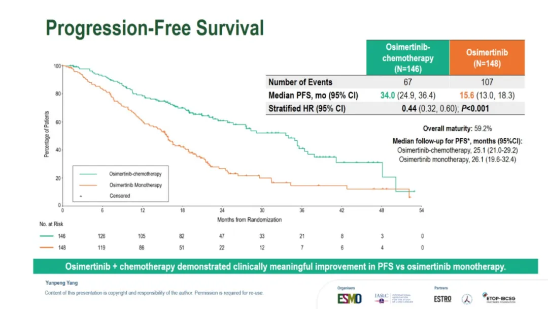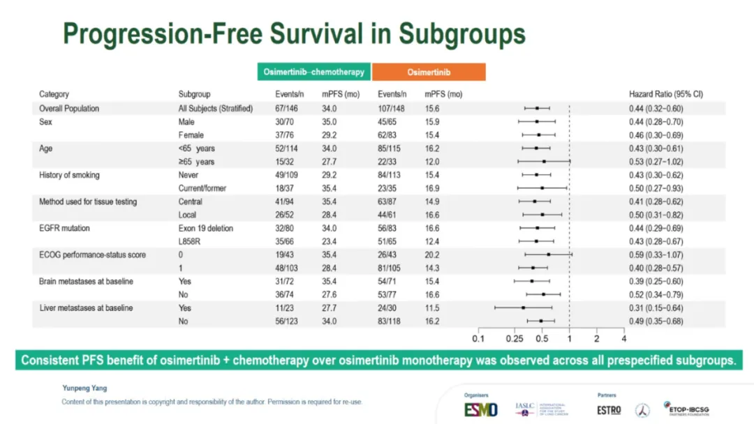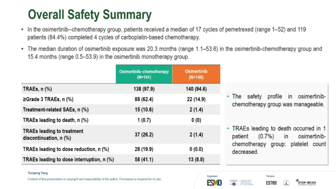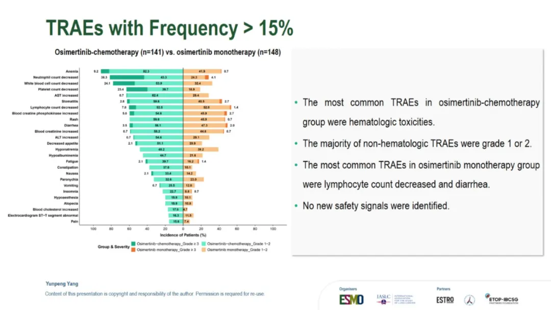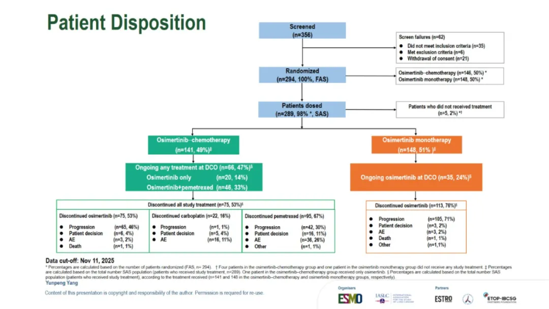 就在昨夜凌晨,TOP研究进行了口头汇报,因此也让我们看到了此次公布的所有数据:TOP研究的leading PI是广州中山大学肿瘤防治中心的张力教授,此次进行口头汇报的是杨云鹏。背景其实没什么特别的,大概意思就是:EGFR合并TP53共突变的患者预后差,因此可能更需要强化治疗。以下是研究设计。和FLAURA2相似,只是入组人群选的不是所有EGFRm的而是同时合并TP53共突变的。主要研究终点是PFS。预计的PFS HR是0.65,OS会在PFS分析的时候做一次分析,在60%成熟度的时候做最终分析。由于前几天发的一篇文章我在想为什么TOP和ACROSS2的PFS大相径庭,我提出了是不是因为ACROSS2研究中患者自行决定停药的比例太高?PFS翻倍,延长1.5年【2026 ELCC 奥希替尼联合化疗治疗EGFRm合并TP53共突变NSCLC的TOP研究结果公布了】因此,在看TOP研究的时候我也特意关注了这点。但是TOP研究中并不高,都在个位数,只是培美维持治疗时患者决定停药的比例略高是11%。再来看看基线:研究设计中,将是否有脑转移、19 del 还是21 L858R以及PS 0和1进行了分层,所以尤其这几个因素上,基线肯定是平衡的。脑转移患者占到了将近50%。像摘要中写的一样,mPFS是34.0 vs 15.6m,延长了18.4个月,也就是一年半。HR值是0.44,低于预期的0.65,而P值<0.001也低于设定的0.005,因此PFS是具有统计学差异的。数据成熟度59.2%。与摘要不同的是,这里还一起公布了OS的结果:48.4 vs 36.5m,延长了11.9个月,也就是将近1年。HR 0.57,成熟度30.6%。根据最初的统计分析计划不难猜测,由于本次OS并未成熟只是随着PFS一起进行了分析,因此后续在接近60%成熟度的时候还会进行OS的最终分析。ORR和DCR都提升了,而且从DoR的数据来看,32.7 vs 15.3m,也就是说,一旦缓解,联合治疗组的缓解持续时间会更久。对于安全性, 也没什么特别的,联合治疗组的毒性肯定是更大的。下面是发生率>15%的TRAE的详细情况:结论:疗效不错安全性可控。在这次的PPT中比较遗憾的是,并没有看到TP53m患者的具体类型,比如是几号外显子突变,另外对于药物暴露时间也没有公布。因此这些数据细节,只能寄期望于后续发表的全文了。想要原版PPT的,请加微信: