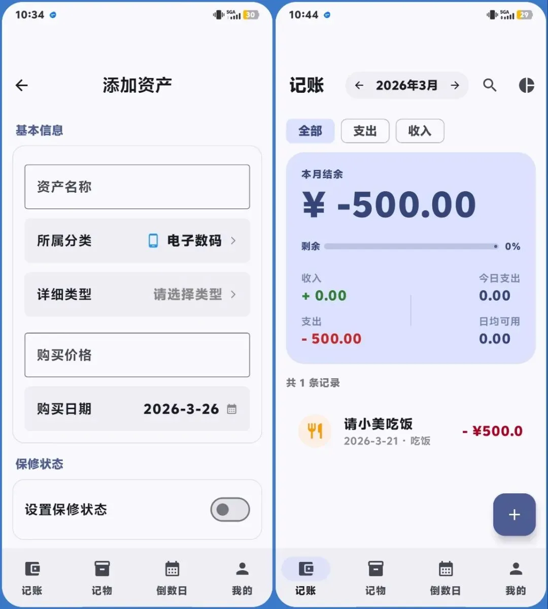 虽然简洁,却集齐了三大常用功能:记账、记物、记日子。