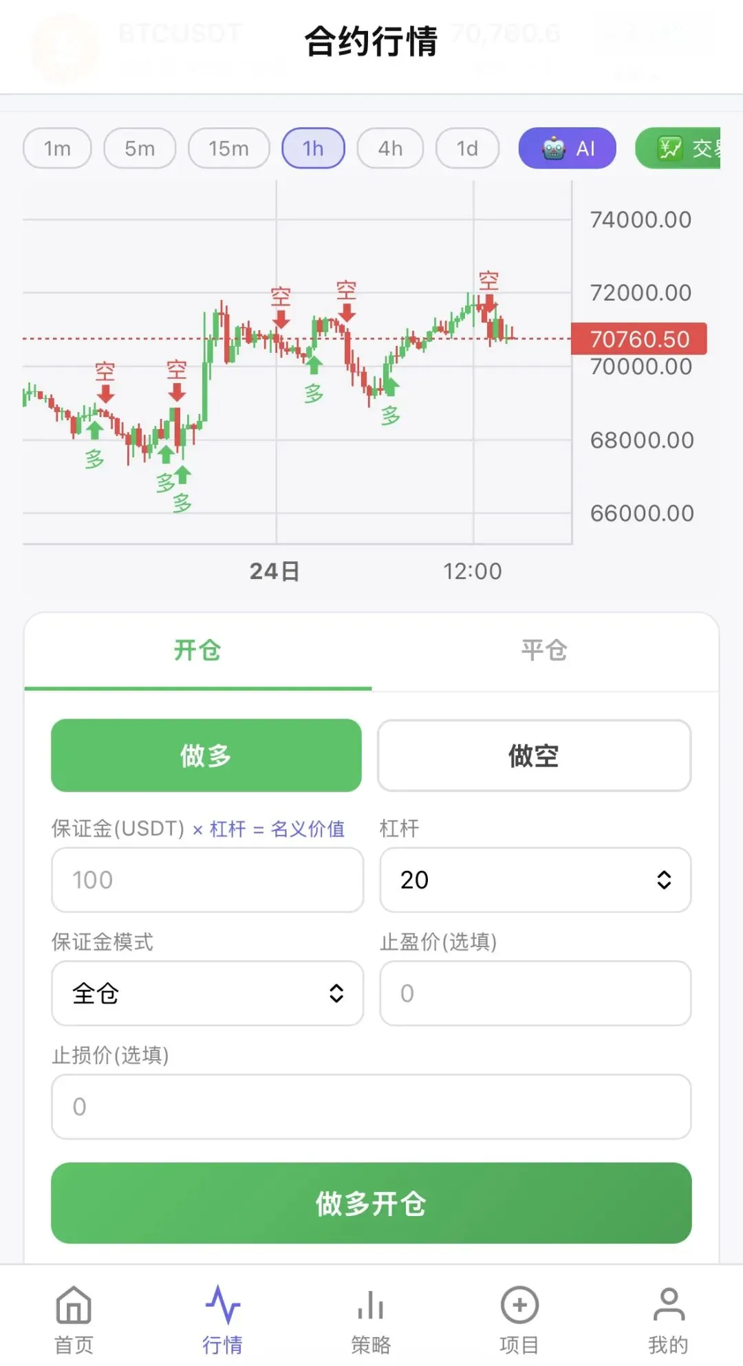 支持设置杠杆倍数、选择全仓或逐仓、设置止盈止损价格。