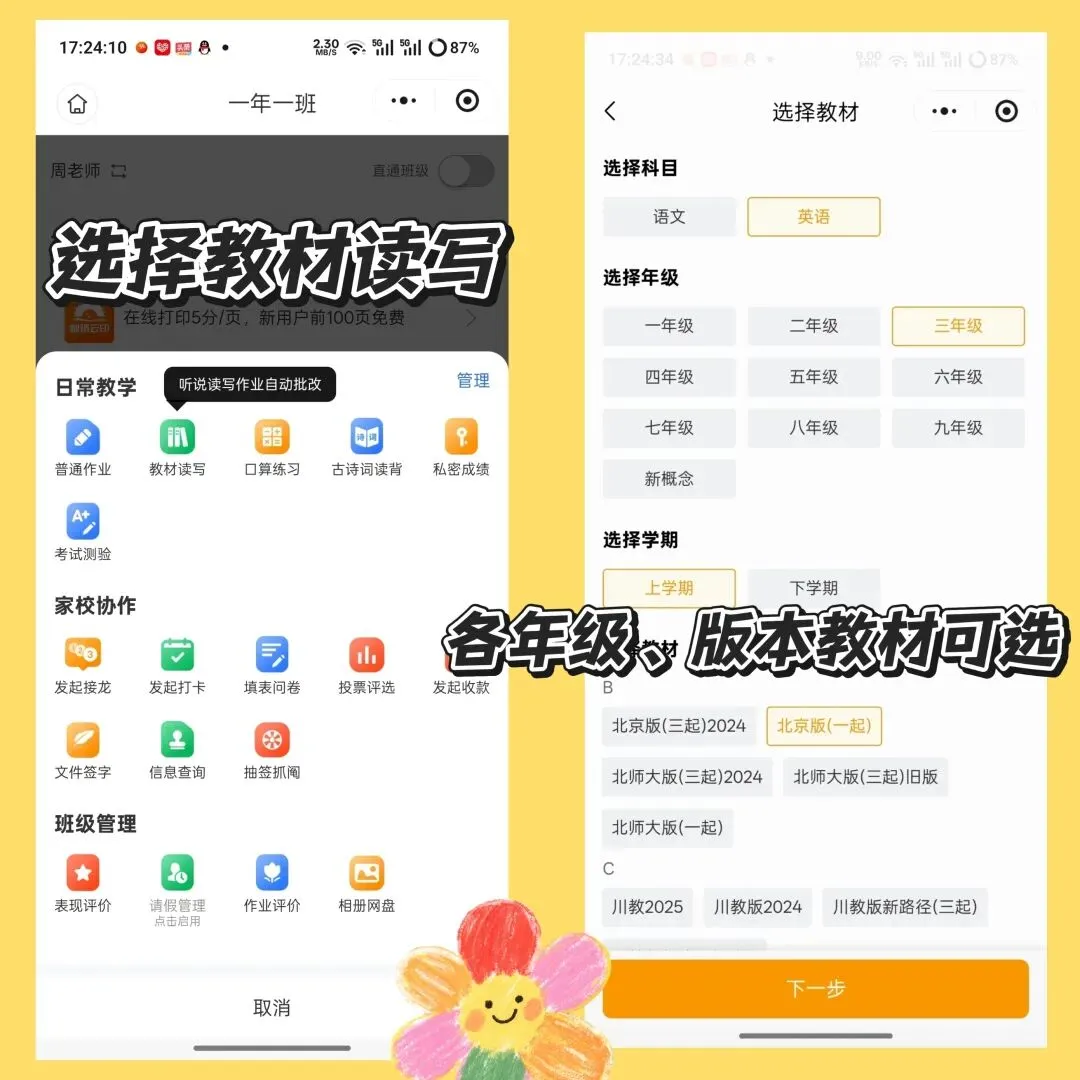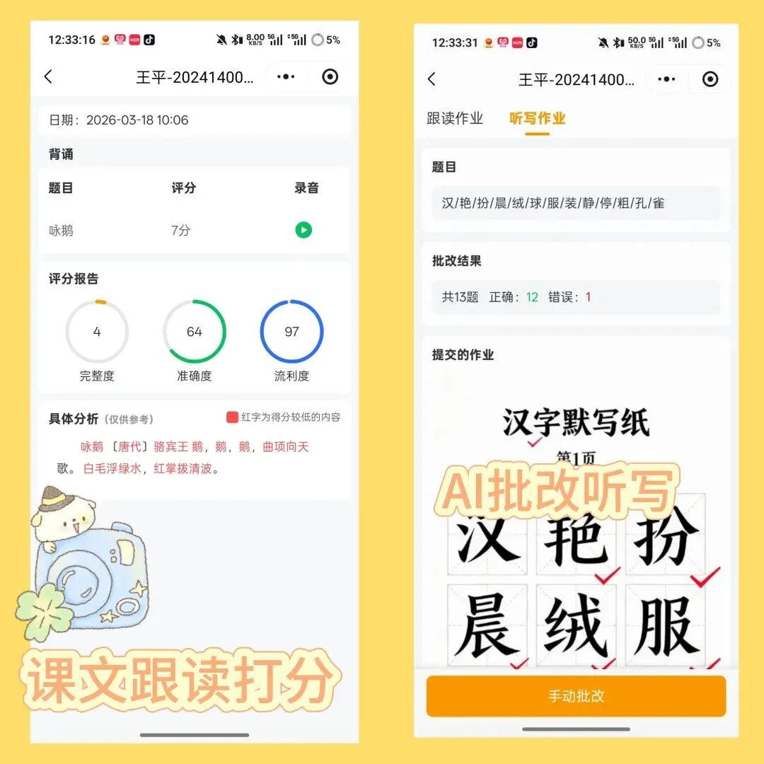 老师能一键发布语文英语的跟读、听写、背诵任务,系统自带标准发音示范,通过 AI 语音评价技术,从准确度、完整度、流利度三个维度给学生录音打分,哪里读错了标得明明白白,不用老师逐个听;