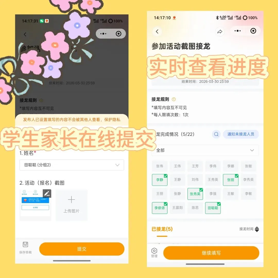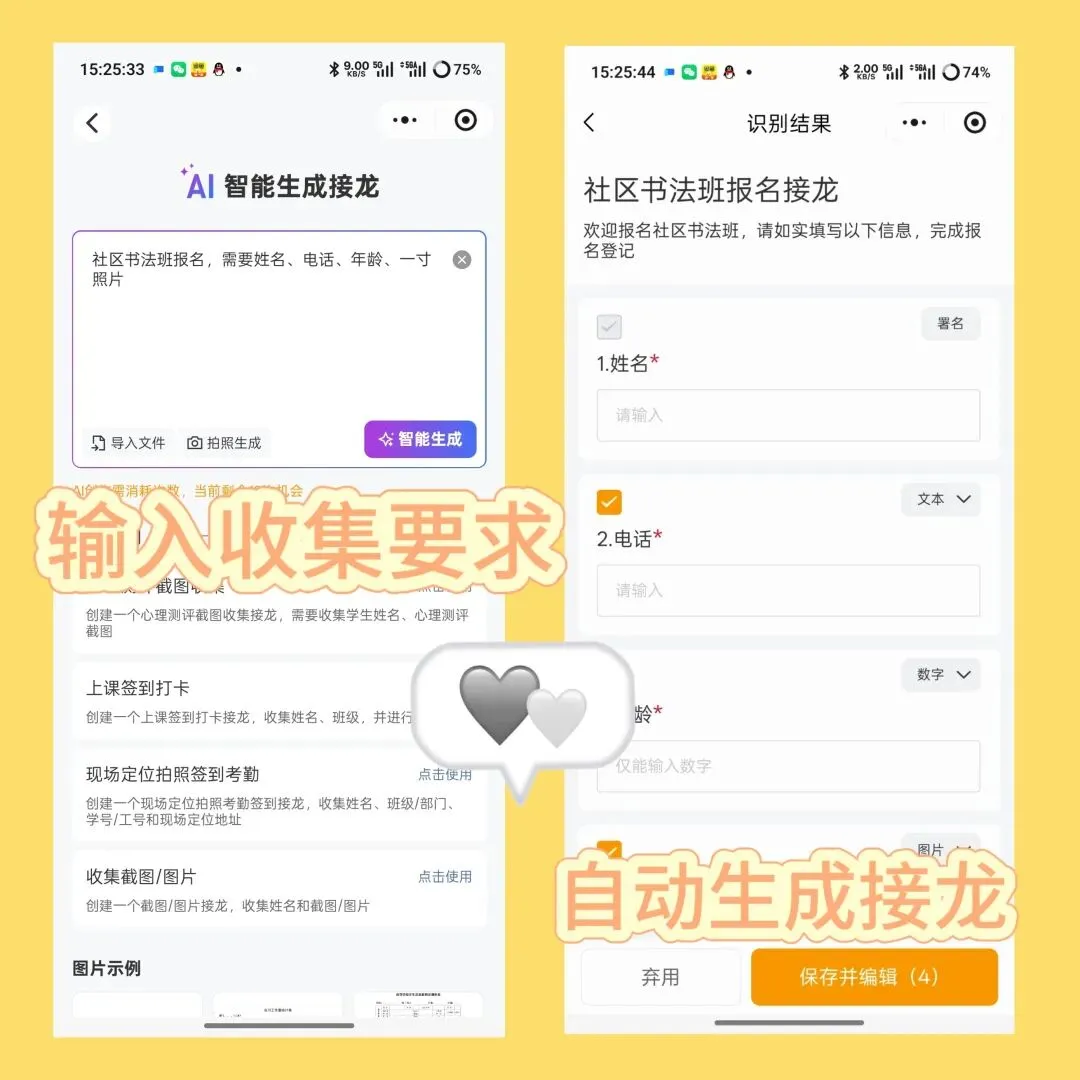 班级通知、返校统计、收缴费截图…… 这些琐碎但必须做的事,接龙管家 AI 创建功能一句话就搞定。老师只要说需求(比如 “收学生餐费缴费截图”),AI 10 秒生成带所有字段的接龙页面,点一下就能发班级群。