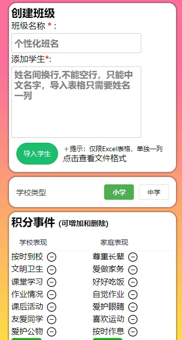 班班优化大师小程序上线几年了,一直提供积分管理,创建班级导入名单分分钟搞定,积分事件也可以先用默认的,后面在完善补充,可以说晚上建好,第二天就可以用。