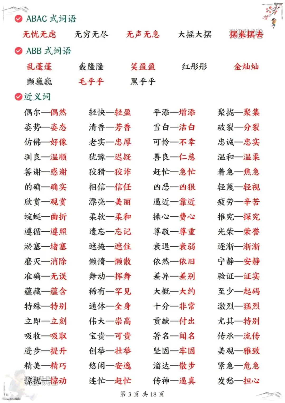 26新版三年级下册语文《全册知识点汇总》,电子版可下载可打印。 这份知识点汇总覆盖了整个下册的内容,从古诗文的原文译文注释,到重点字词的四字词语、AABB式词语、AABC式词语,再到近义词反义词、形近字同音字、成语释义和句子仿写,每个知识点都有详细的归纳整理。每天复习几页,从古诗积累到词语辨析,再到句式训练,孩子跟着做,基础知识掌握得更牢,语文素养提升得更快!家长们抓紧打印出来,让孩子寒假预习起来吧!