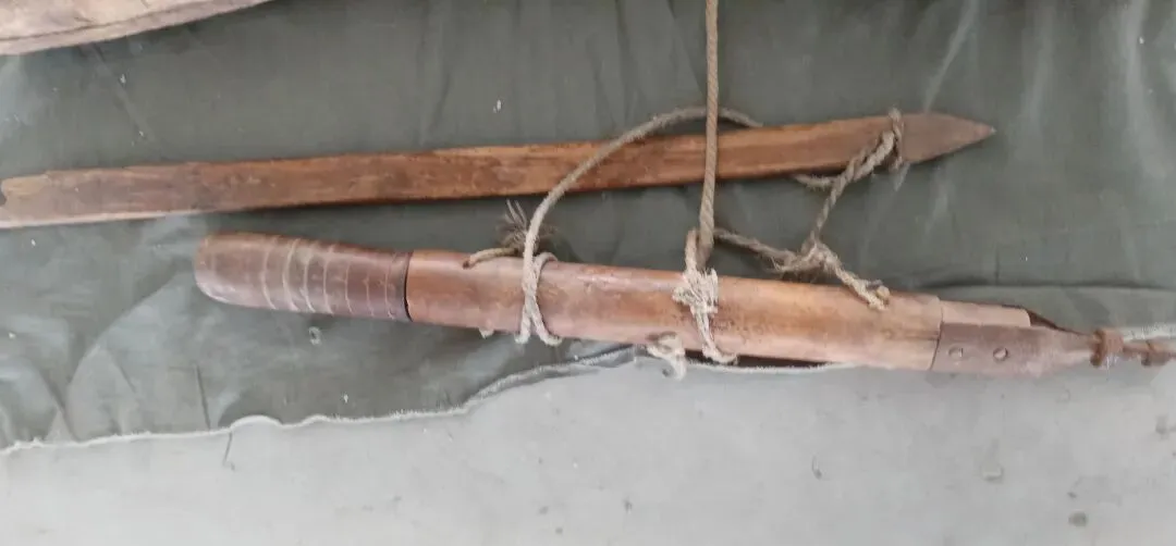 图中这把细长的锯叫框锯,两根直立杆把锯条绷在中间,横梁上绕着麻绳或者铁丝,拧紧了锯条才发直,老匠人抄起来,两手一推一拉,齿儿在木头里吱呀地唱,切板开榫都靠它稳着来。