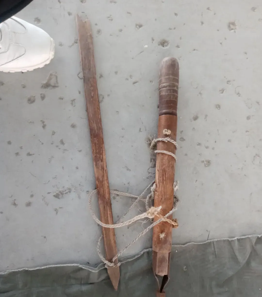 这个长把的家伙叫木钻,粗把手一握,前头是可换的铁钻头,旁边那根尖木桩是打样桩,先在板上点眼儿,再把钻头对上去,手腕子一拧一压,孔就冒出来了。