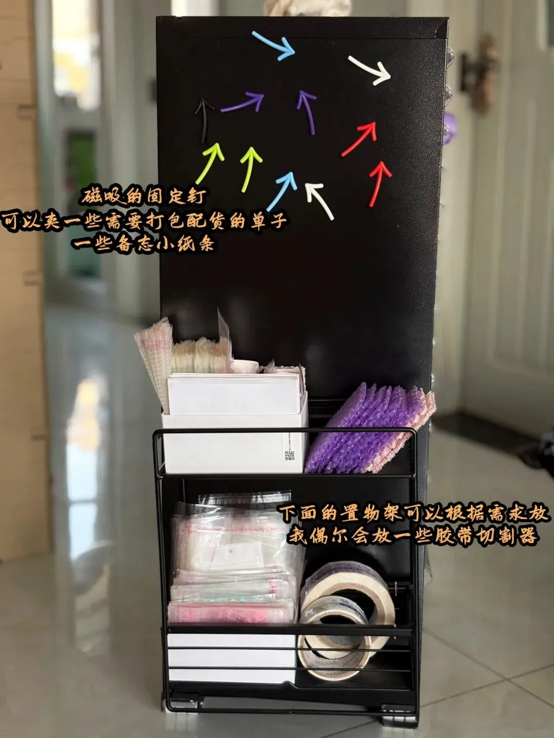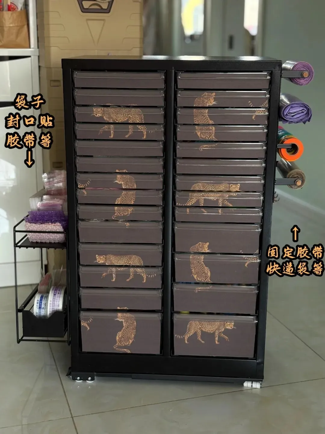 左边装磁吸抽拉置物架,专门放高频打包用品!打包袋、胶带、气泡膜这些常用物,抽拉即取,再也不用满屋子翻找。抽拉设计拿取超顺手,满满当当装常用打包耗材不拥挤,动线直接拉满~