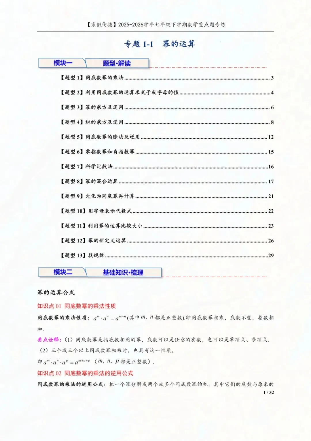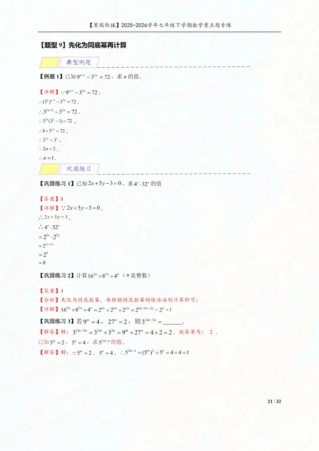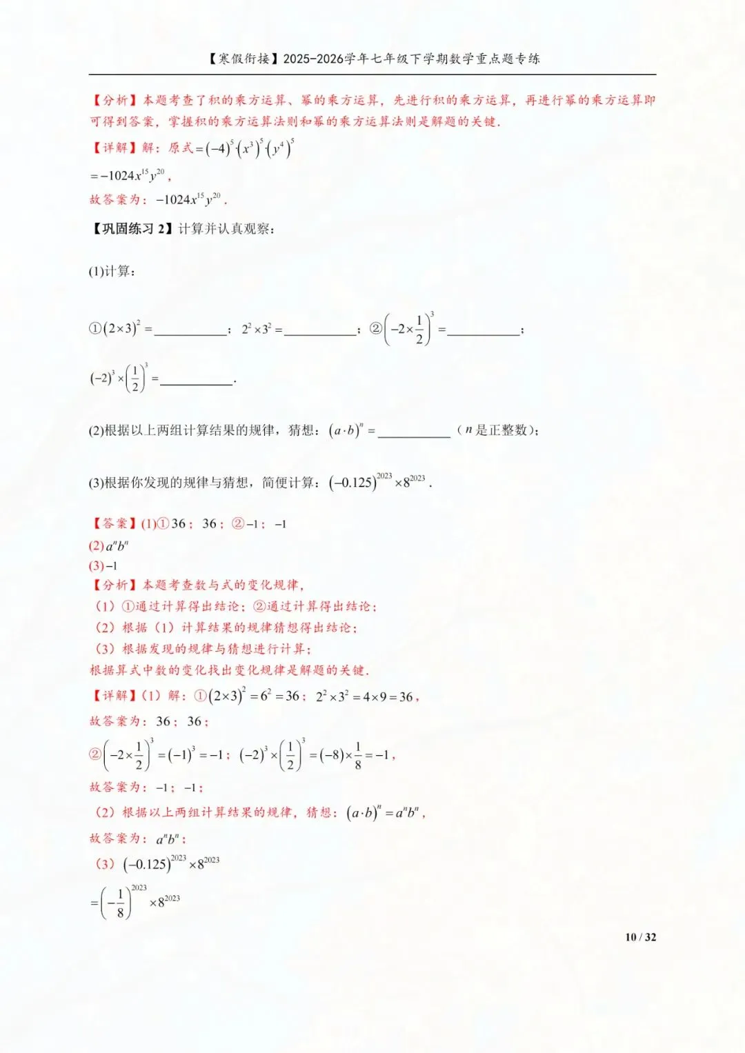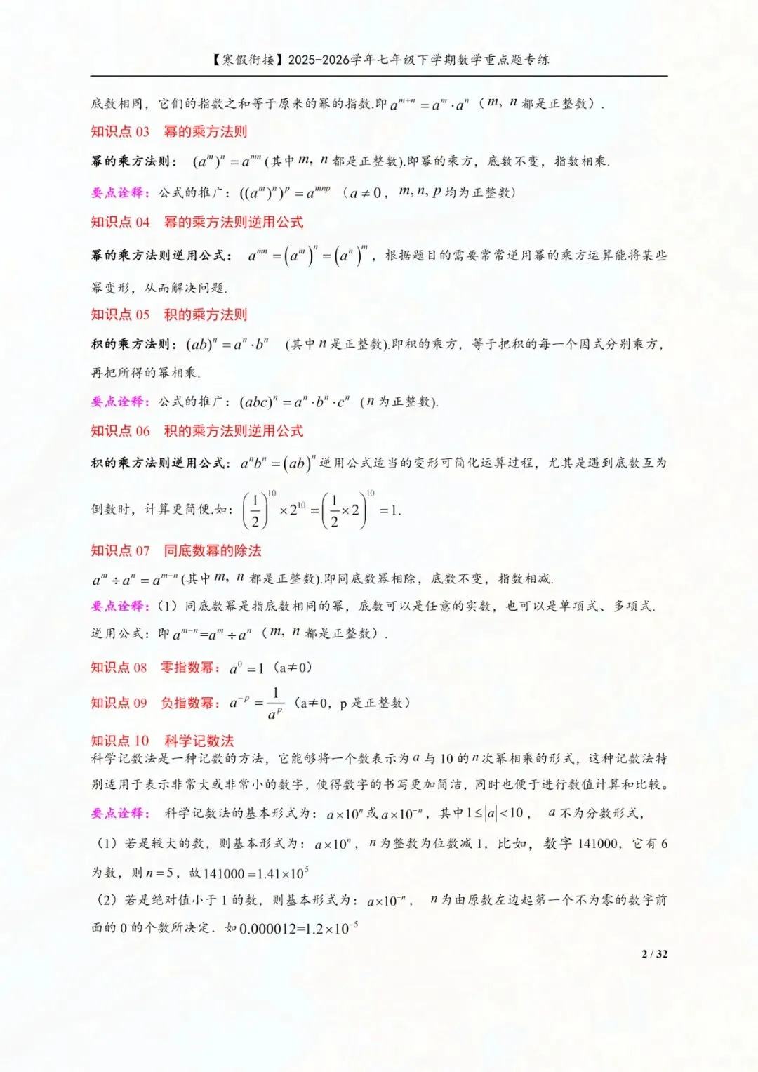 今天老师给大家整理了:七年级下册数学幂的运算重点专练电子版可打印!