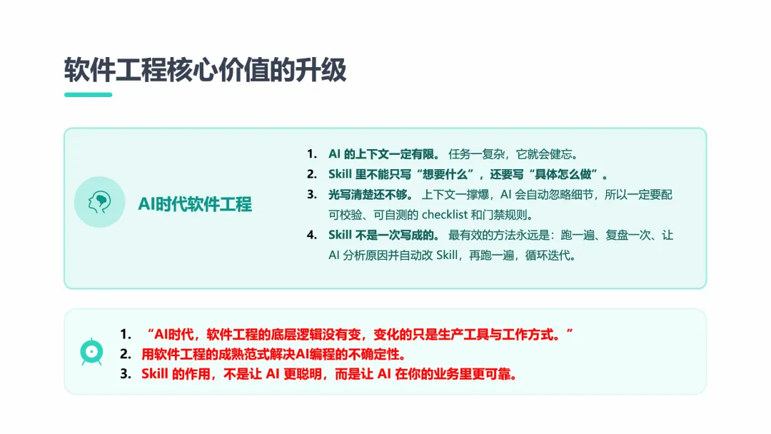 Skill的作用,从来不是让AI更聪明,而是让AI在你的业务里更可靠。而我们要做的,就是完成从执行者到决策者的角色跃迁,用规范约束AI,而不是被AI的自由发挥牵着走。