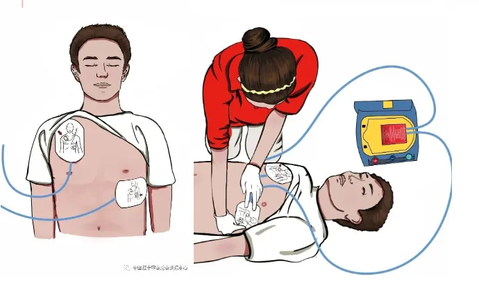 注意:如果现场有两名施救者,在一名施救者实施心肺复苏的同时,另一名施救者开始操作AED,不能因为贴电极片而中断心肺复苏。