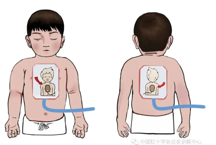 将两片电极片分别贴在婴儿和儿童的胸前正中及背后左肩胛处,体格较大的儿童也可如成人的位置贴放电极片。